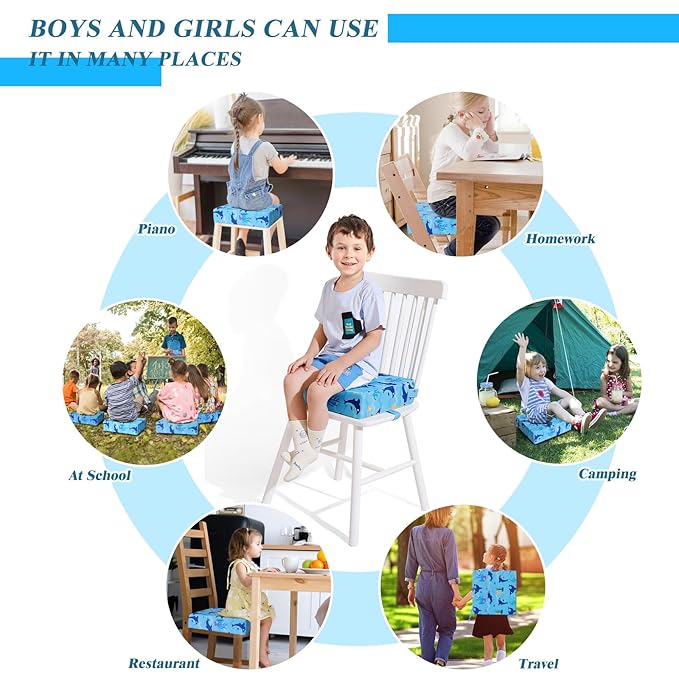 - [Versatile Use] Our kids booster seat for dining table are colorful and have a cute dinosaur and Shark design to enhance your kid's enjoyment of mealtime.Portable booster seat can be used at home for eating, drawing, playing, or as a high chair booster seat for going out to restaurants, traveling, and other public areas