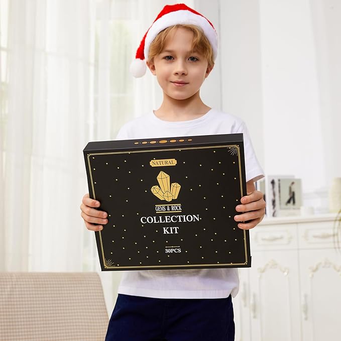 - Exquisite Rock Collection Kit Gift Box: A perfect rock collection kit for kids, This toolkit includes 30 pieces of natural rocks, gemstones and crystals, as well as a magnifying glass, Brushes and a full color learning guide.