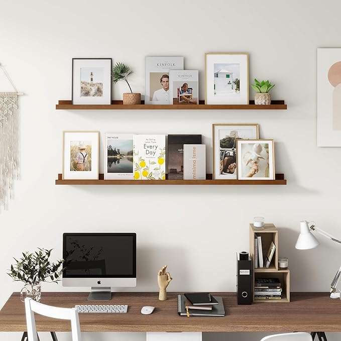 Picture Ledge Wall Shelves 24 inch Width Set of 2, Solid Pine Wood Rustic Floating Ledge Shelves for Wall for Kids' Room Bedroom Kitchen Bathroom Living Room Nursery Display Wall Decor, Walnut