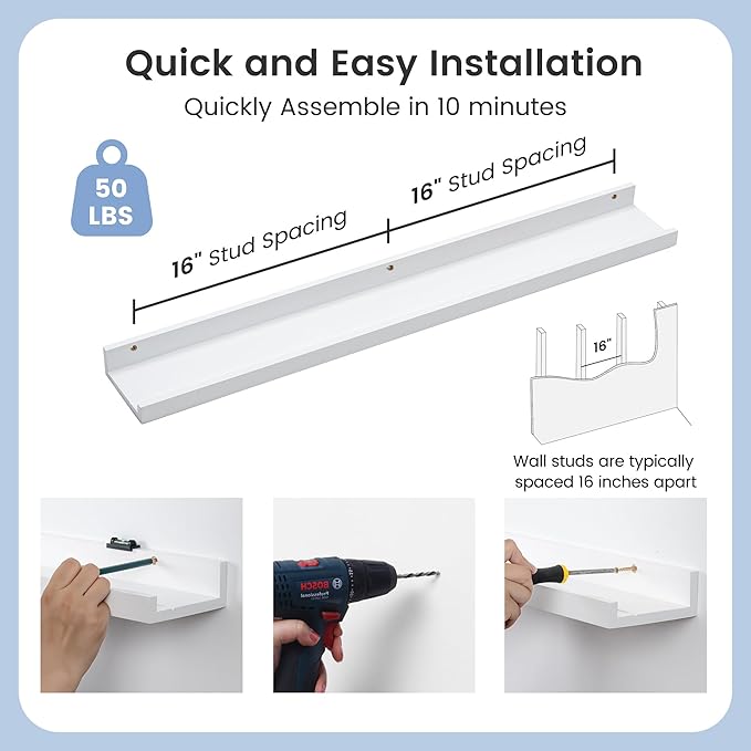 - Easy to Install: You will get a level, screws for the wall, drywall anchors, a detailed installation guide, and two beautiful hand-crafted solid pine wood shelves. With the level, you can make sure your picture ledge shelves are well aligned. Just follow the simple instruction to install the hanging shelves for wall decor within 10 minutes. We add additional screw and anchor to the hardware bag just in case. If you have any questions about our products, please feel free to contact us