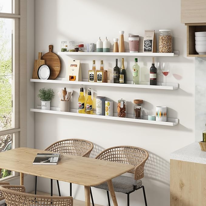 - Multi-scene & Functional: The wall-mounted shelves are designed for decoration and storage, utilizing and decorating any space in your home. Used as shelf decor to show your collection, books, or prize, the hanging shelves are perfect for displaying your photo frame, small plants, model, or audio in your living room, office, study. And can also use as over the toilet storage shelf in the bathroom to hold toiletries or used as a kitchen shelf to store condiments