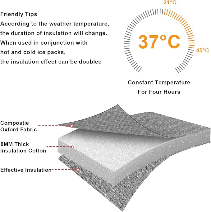 - MATERIALS: Made of water-resistant composite oxford fabric, 8mm extra-thick EPE foam and food-grade aluminum foil liner. Food safe, durable, lightweight. Effectively keep bottles stay cold, warm or fresh for hours, it keeps breast milk fresh.