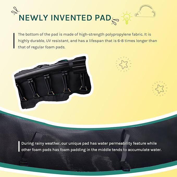 - [ Newly Designed Pad, HIGH-STRENGTH POLYPROPYLENE! ]: Highly durable, UV resistant, water-permeable and has a lifespan that is 6-8 times longer than that of regular foam pads. The pad is sewn with high-quality straps at the bottom, tightly wrapping around the frame to prevent loosening.