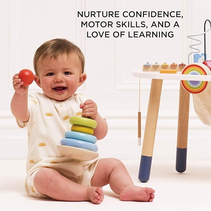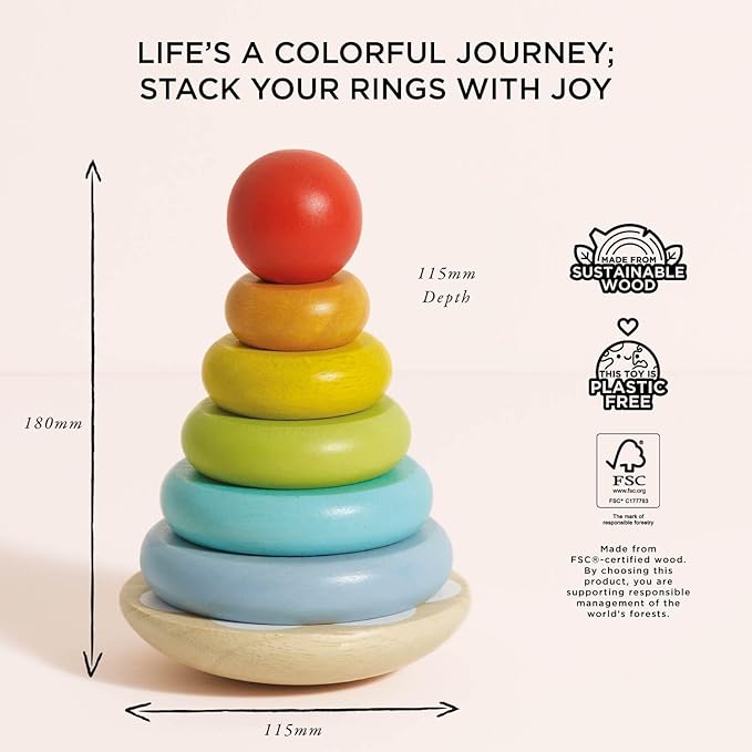 SAFE, HIGH QUALITY, FROM SUSTAINABLE FORESTS - Decorated with water-based, chip-resistant non-toxic paints and tested to the highest safety standards. Includes 5 stacking rings, 1 wobbly base and a cap