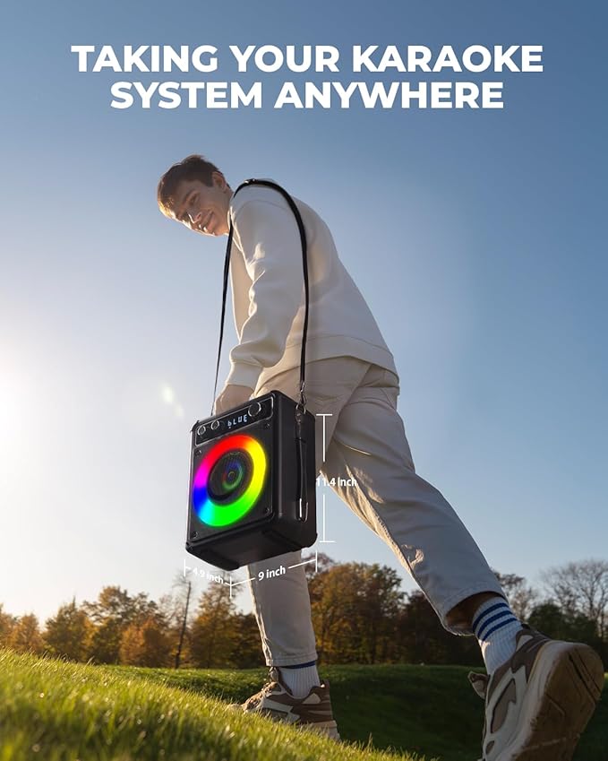 - Ultimate Portability: Take the party wherever you go with the portable outdoor speaker. Featuring a leather carry handle and a shoulder strap, it's easy to carry around. Plus, with its fully charge, you can enjoy 4-6 hours of non-stop singing, making it perfect for outdoor gatherings, upstairs parties, or even on-the-go karaoke sessions.
