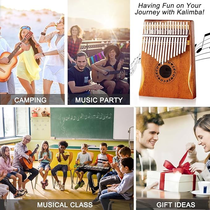 - Ideal Musical Instruments Gift: Come with everything you need: kalimba 17 key, tune hammer, songbook, instruction book, finger protectors, tune stickers, kalimba flannelette bag, and a cleaning cloth. Suitable for beginners, kids, and professionals