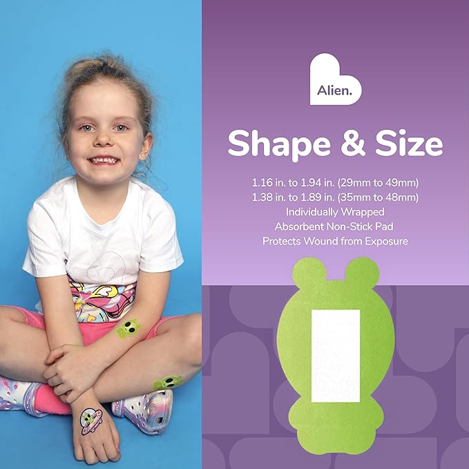 - SAFE PACKAGING: These sterile alien cartoon character bandages come in spooky packaging, and are individually wrapped for safe handling; small bandages help protect kids' sensitive wounds from coming into contact with dirt for first aid wound care