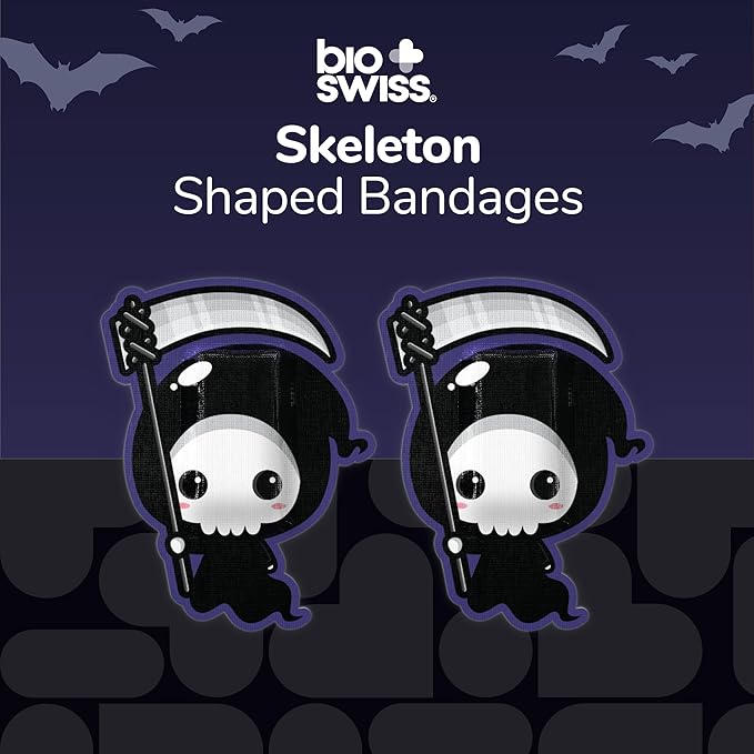 BioSwiss Bandages, Halloween Skeleton Shaped Self Adhesive Bandage, Latex Free Sterile Wound Care, Fun First Aid Kit Supplies for Kids, 24 Count