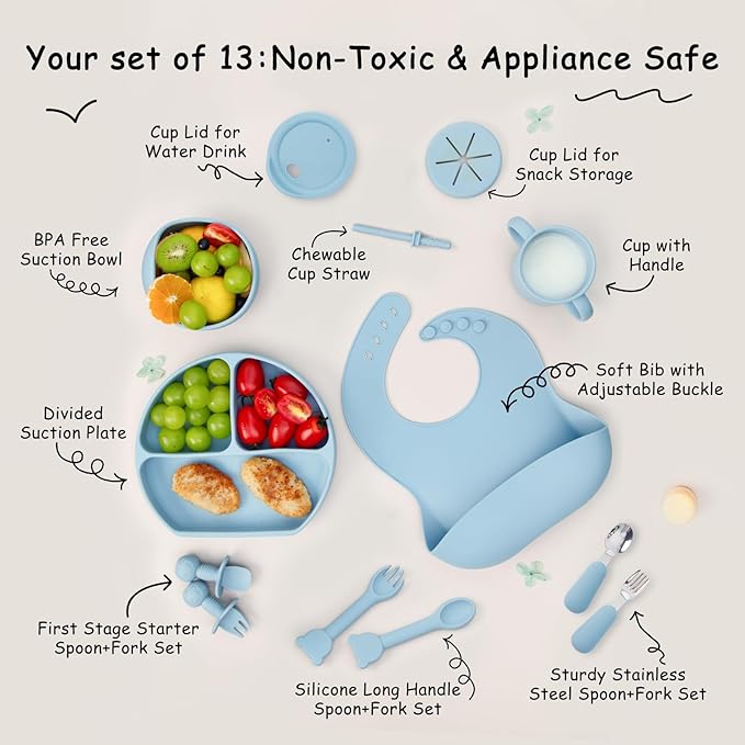 Baby Silicone Feeding Set, 13PCS Baby Self Feeding Set, Toddler Led Weaning Utensils Sets with Suction Bowl and Plate, 3 Set of Baby Spoons and Forks, Adjustable Bid, Sippy Cup with Straw and 2 Lids