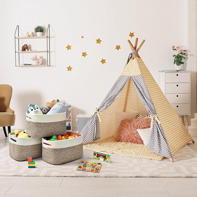 Storage Basket,Woven Baskets for Storage,Cotton Rope Baskets for Organizing,book Basket,towel,Toy Basket or Storage Bins for Living Room - 3 Pack,Brown