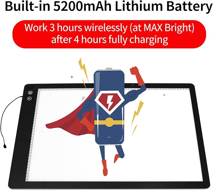 - 【 Built-in 5200mAh Battery 】 Our Upgraded Rechargeable A2 LED lightbox comes with a 5200mAh internal battery which allows you to use it any where without any power source, which makes your project more convenient as well as more enjoyable! Works for around 3 hours at MAX brightness after fully charged 4 hours at a time. This A2 lightpad uses a USB-C interface to easily access any USB port, such as a USB wall charger, computer, laptop or mobile power bank.