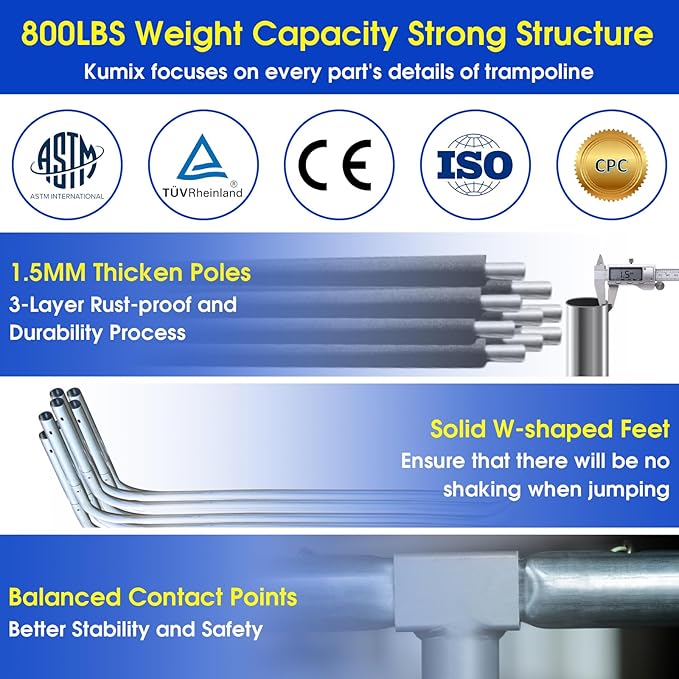 - 🏀Strong Frame and Stable Base: The big trampoline has 6PCS safety poles which were wrapped with soft foam tubes. 3pcs U-type legs keep the stability of the trampoline base. 54pcs 155MM springs matched with a jumping mat make the trampoline has extraordinary elasticity. The trampoline still can keep in a good condition after more than 20000times tests under more than 1000lbs.