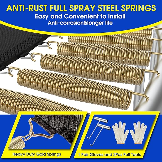 - πUpgrade Waterproof Trampoline Material: Added waterproof and anti-UV safety poles foams which can protect the safety poles away being broken, and extend the lifetime of the trampoline. PP spring pad and high-strength woven jumping mat are also waterproof. Extra including 3 set trampoline wind stakes. Greatly reducing the risk of trampolines being broken in bad weather. Reducing your economic loss.