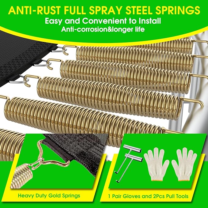 - 🌼Easy To Assemble In 1 Hour: The trampoline can be installed by 2 adults in 1-2 hours according to our detailed graphic manual. All parts and installation steps are listed and numbered. Spring tools are furnished in the package. 100% sense of achievement during assembling trampoline. New design trampoline is definitely the best gift for kids - jump higher, grow faster, stay away from electronics; burn off kids' energy, and let you enjoy your own time.