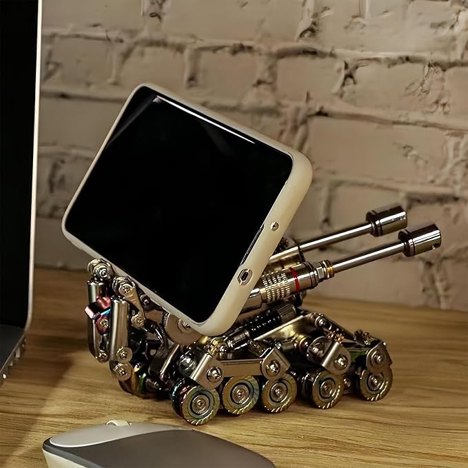 - Design Highlights : This mechanical metal tank can rotate the turret 360 °, with a multi angle folding body that can be directly deformed into various new forms, or can be transformed into a desktop phone stand. After assembly, the size is 5.9x3.55x2.36 inches, which is very suitable for office desktop decoration or home decoratio