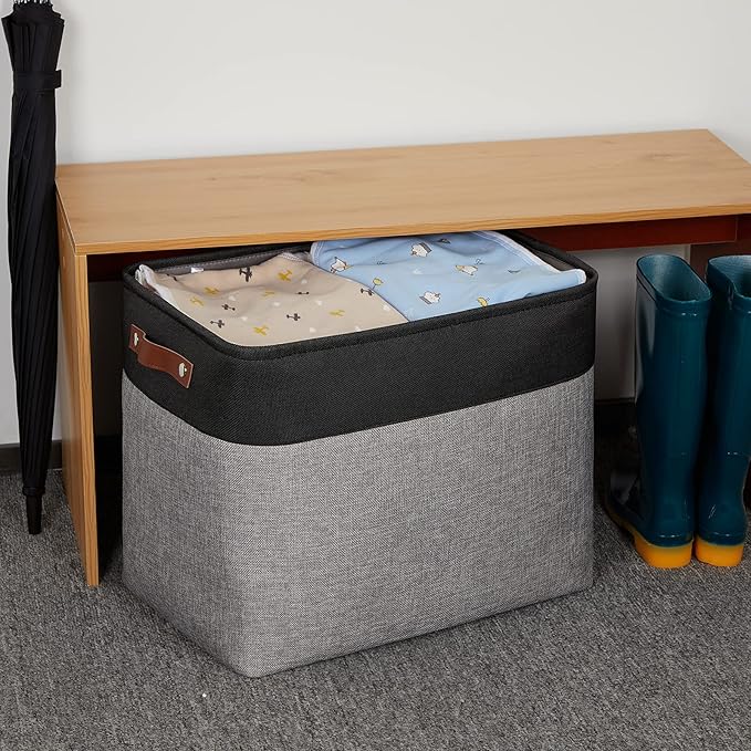 - 【Unique Design & Modern & Decorative】Set of 2 large storage baskets, dimensions(each): 17(L) x 12(W) x 15(H) inches. Collapsible storage baskets bring you organizing convenience and a sweet home. Great for socks, underwear, books, magazines, toys, baby clothes, pet products, wipes, towels, decorations, office supplies, DVDs, and gifts. The fabric baskets with neutral colors can match a lot of home styles - keeping your home nice and tidy.