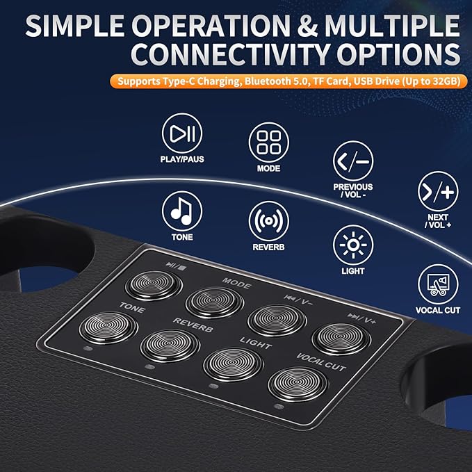 - [Choose your preferred audio source mode] Our bluetooth karaoke machine for adults features built-in bluetooth 5.0, providing compatibility with most wireless bluetooth devices. Additionally, it offers a Micro TF card slot (up to 32GB) and a USB flash drive slot (up to 32GB), allowing you to play your favorite music from various sources. The karaoke machine with 2 microphones and multiple audio sources is an ideal choice for personal gatherings, street performances, and fitness instruction