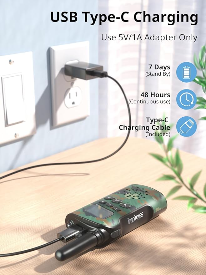 - Inspireyes rechargeable kids walkie talkies are rechargeable and long lasting, featuring an upgraded built-in lithium polymer battery. There is no need to buy extra AAA batteries. Kids can enjoy up to 48 hours of playtime and 7 days of standby on a single charge.