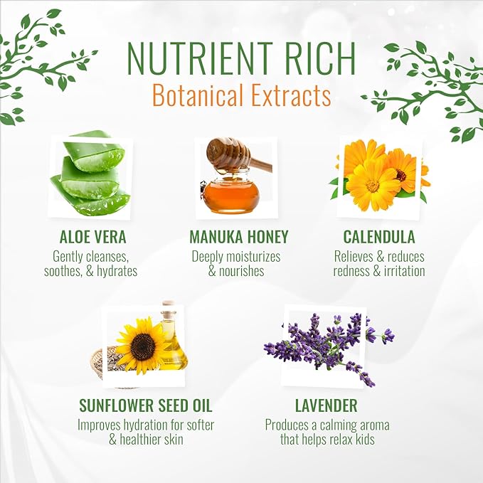 NATURALLY NOURISHING ECZEMA WASH FOR KIDS - Made with manuka honey, sunflower seed oil, and soothing botanicals, this eczema body wash for babies support soft, healthy-feeling skin from head to toe.