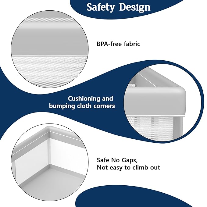 - SAFETY &HEALTH MATERIAL:Our baby playpen is made of safe and sturdy materials, skin friendly and non-toxic BPA-FREE fabric, thick plastic parts and stainless steel pipes, and bottom suction cups make it not easy to move. It no gaps, making babies not easy to climb out.Our baby play pen is designed to create a healthy and stable castle for babies, so you can use it with confidence.