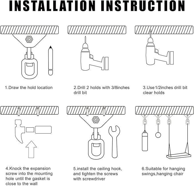 Widely used in WOOD and CONCRETE : Our swing hardware provides 2 SCREWS for WOOD and 2 EXPANSION BOLT for CONCRETE, Perfect for Ceiling, Punching Bag, Porch Swing, Hammock, Swing Chair, Ring, Yoga Swing, Boxing Equipment, etc.