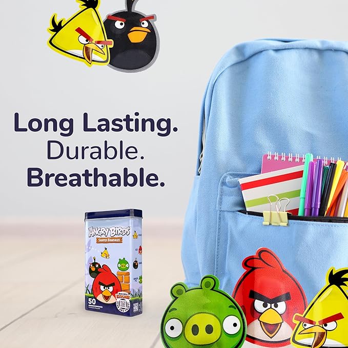 BioSwiss Bandages, Angry Birds Game Shaped Self Adhesive Bandage, Latex Free Sterile Wound Care, Standard Shape for Kids and Adults, 50 Count