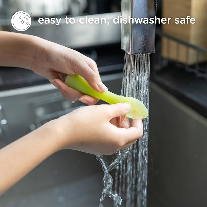 • INNOVATIVE DESIGN: Inspired by natural plant elements, the leafy flexible silicone tip enables scooping food at any angle. Spoon base allows for hygienic, upright placement on any surface, keeping the spoon clean.