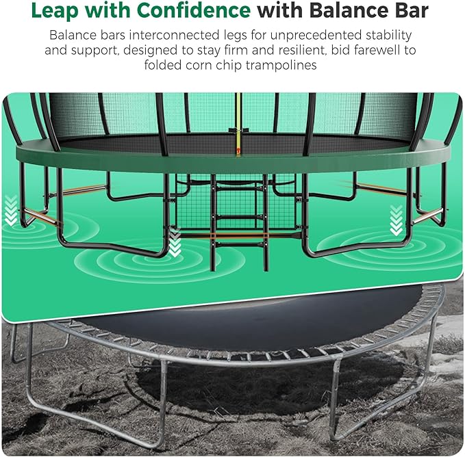 - 【Safety Comes First】Our 15FT pumpkin trampoline prioritizes safety with its curved pole design and inner net. You'll find 12 curved poles, each wrapped in soft foam and covered with waterproof plastic. Not only does this enhance the trampoline's durability, but it also safeguards your children from collisions with steel poles