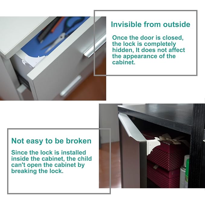 - Hidden Magnetic Lock : Compared to traditional cabinet locks, this child proof magnetic cabinet lock is installed inside the cabinet and opened with a magnetic key. After the door is closed, the toddler cabinet locks is completely hidden inside the cabinet.