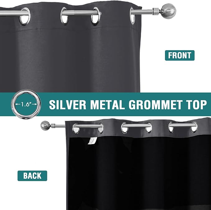 SET DETAILS: Set of 2 charcoal gray total blackout curtain panels per package. Each lined curtain measures 52 inch wide by 84 inch long with 8 silver metal grommets (1.6 inch inner diameter) on top, easy to install and slide.