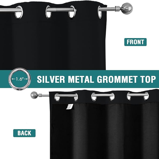 - SET DETAILS: Set of 2 total blackout curtain panels per package. Each lined curtain measures 52 inch wide by 63 inch long with 8 silver metal grommets (1.6 inch inner diameter) on top, easy to install and slide.