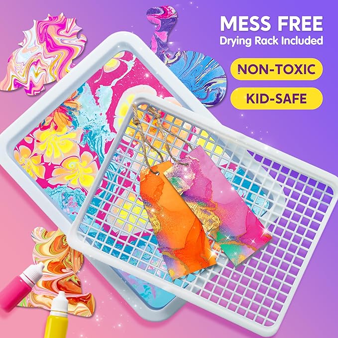 - Mess-free with Drying Rack: Our kit includes a perfectly sized drying rack that matches the art tray, effectively containing paint drips and promoting efficient drying of your marbled creations. Enjoy the convenience of hassle-free drying by simply placing your artwork on the rack and maintaining a tidy workspace.