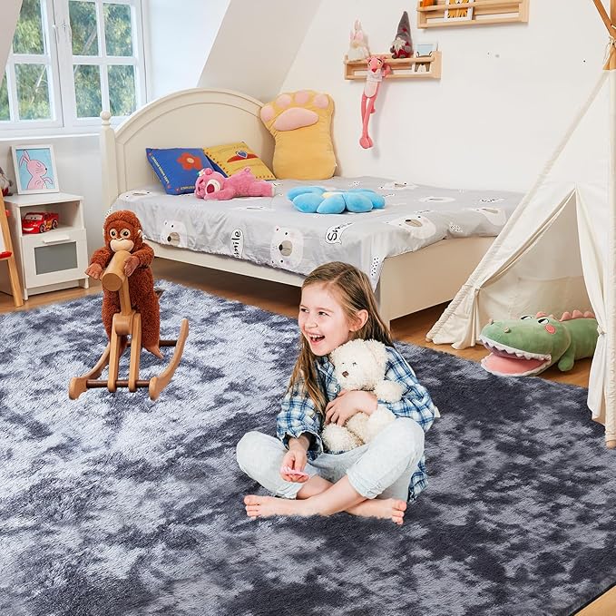 Ultra Soft Rug for Living Room, 9X12 Fluffy Shag Area Rug for Bedroom, Modern Shaggy Carpets Fuzzy Rug for Teens Dorm Nursery Home Decor Aesthetic, Upgrade Anti-Skid Durable, Tie Dye Black and Grey