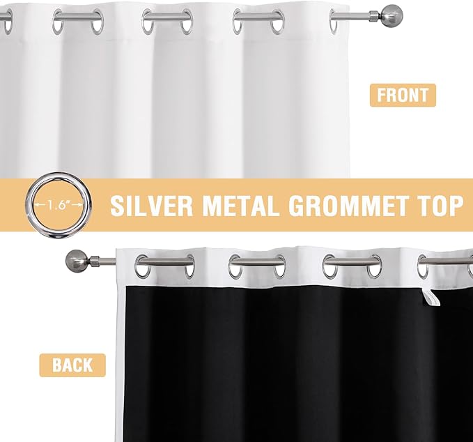 SET DETAILS: Set of 2 total blackout curtain panels per package. Each lined curtain measures 42 inch wide by 54 inch long with 6 silver metal grommets (1.6 inch inner diameter) on top, easy to install and slide.