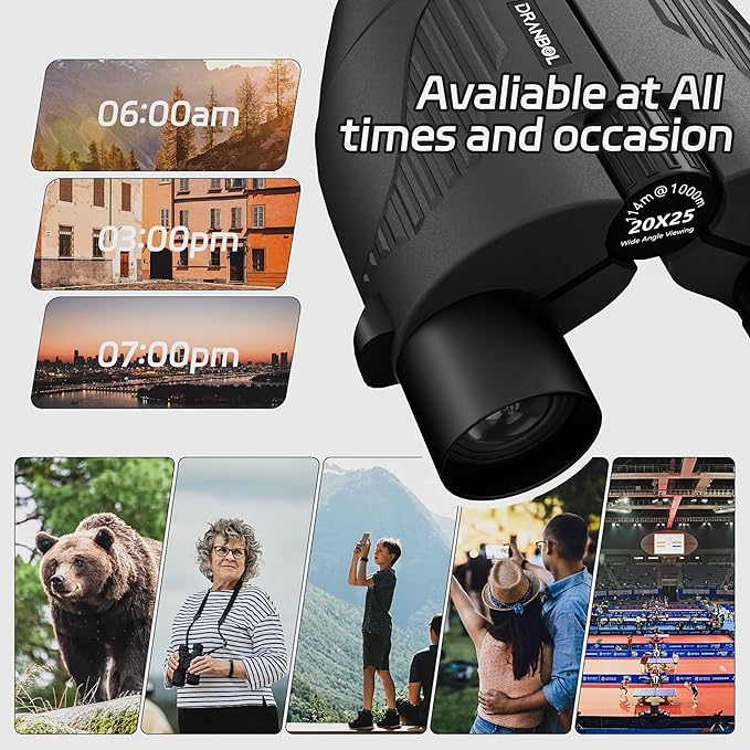 - [16mm Large Eyepiece and 20x High Magnification] Our 20x25 binoculars for adults with 16mm large eyepieces, which renders larger images and provide a more comfortable wide field of view, ensuring clear details without color distortion or blurring. 20x magnification allows you to observe complex features in the distance without losing sight of the target, allowing you to see everything in the distance without any effort.