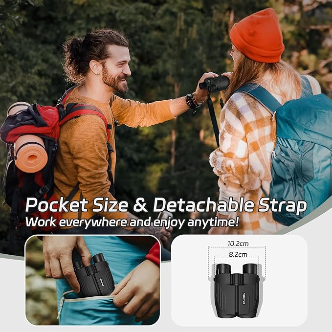 - [Ergonomic Design]Designed with ergonomics in mind, the compact binoculars has a size that fits comfortably in your hand. It features a rubber anti-slip strip on the front for shock absorption and slip resistance, while the back has a groove for your thumb to grip easily. It comes with a storage bag that can be attached to a belt and a wider and stronger neck strap, reducing the burden when wearing, and there is no need to worry about the strap breaking easily.