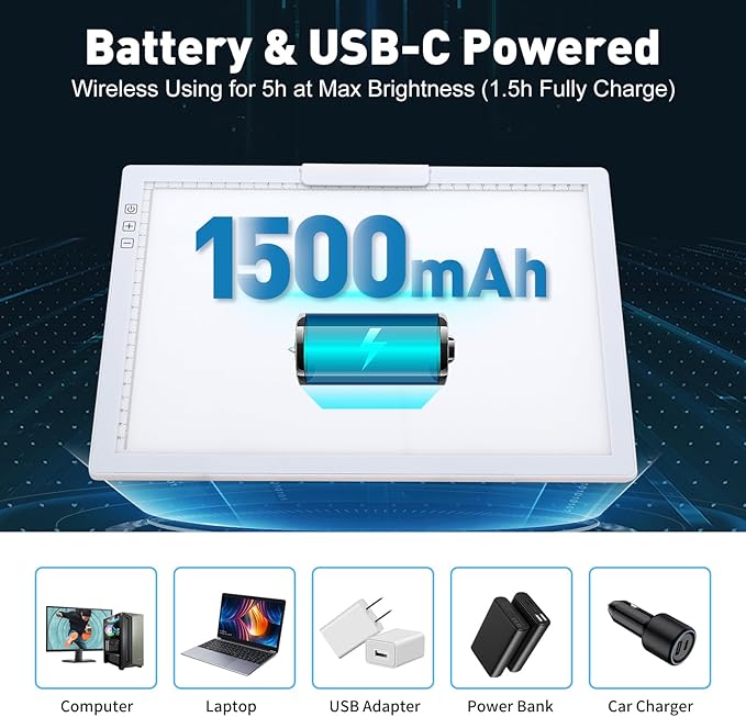 - 【 Battery and USB-C Powered 】 The light tracing box let you enjoy the convenience of working wirelessly at anywhere you like with the built-in battery. This rechargeable light pad can work for approx 5 hours after fully charged(1.5h). Battery and USB-C power mode are both available. Also, the USB-C interface is more stable than the Micro interface.