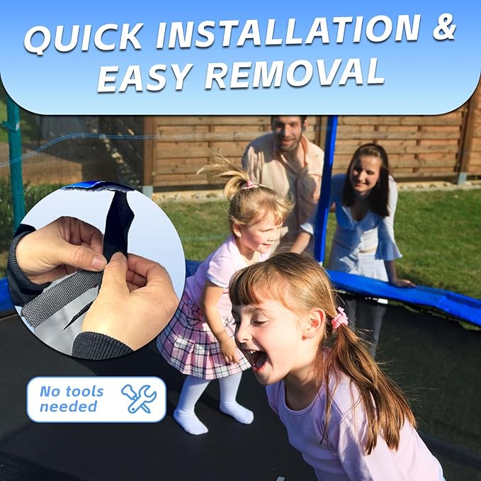 Quick Installation and Removal: With a simple and easy design, the outdoor trampoline safety pad can be installed or removed in just about 5 minutes, making it easy for quick trampoline use and convenient storage