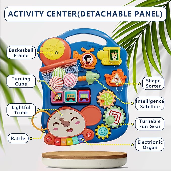 - [Detachable Entertainment Table]: This removable play panel features 3 shape recognition blocks, 3 colorful spinning rollers, 5 piano keys, 1 mobile phone toy, butterfly music button with 8 songs, this new design panel is very useful to help baby recognize colors and shapes, developing sense of rhythm, encouraging your baby’s creativity.