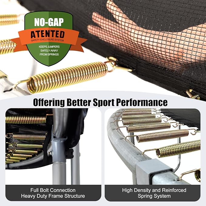 - Reinforced Frame Structure and Spring System: The trampoline features high-density spring system, prioritizing safety and providing a superior bouncing experience. The heavy-duty U-shaped steel frame and trampoline stakes provides extra stability