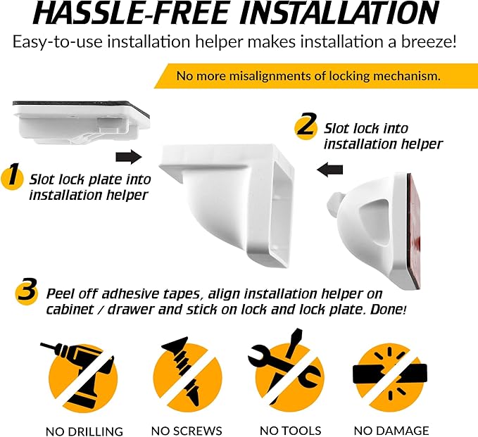 - EASY INSTALLATION: Our unique baby-proofing drawer lock is made by experts to ensure you get the best. It is easy to install with two installation methods. You can use the red 3M VHB adhesive tape or screws provided.