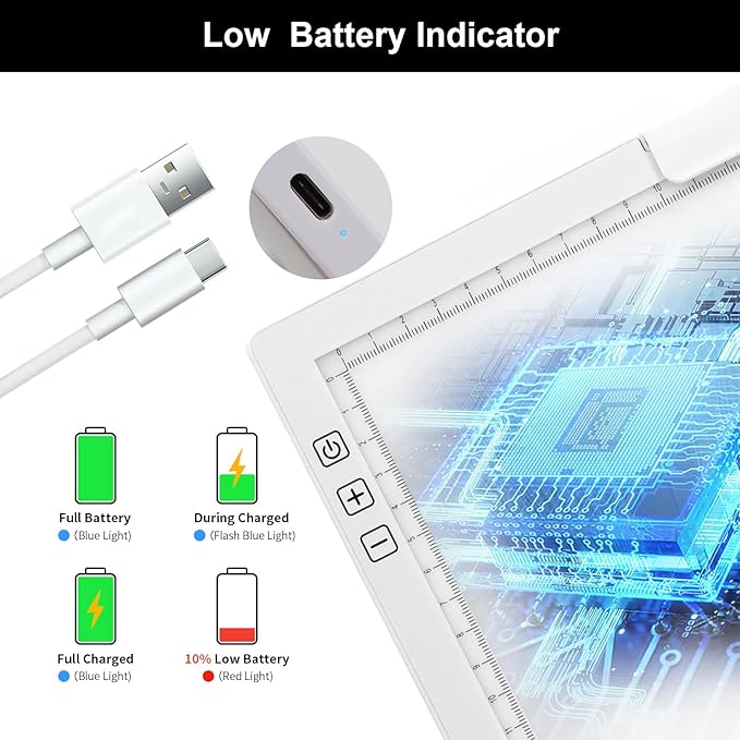 - 【 Built-in Battery and USB-C Powered 】 Our LED lightbox comes with a internal battery which allows you to use it any where without any power source, which makes your project more convenient as well as more enjoyable! Works for around 5 hours after charged 1.5 hours at a time. This A4 lightpad uses a USB-C interface to easily access any USB port, such as a USB wall charger, computer, laptop or mobile power bank. Also,the USB-C interface is more stable than the Micro interface.