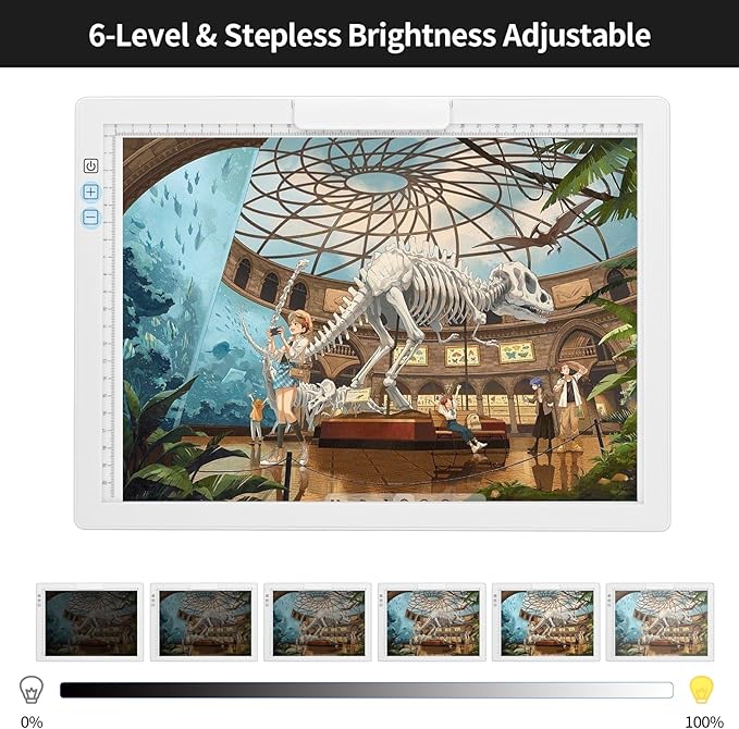 - 【 6-Level/ Stepless Dimmable Brightness 】 Gives a STEPLESS change in brightness by long press on the touch button, shortly press to choose 6 levels brightness. To meet your different needs. With 3000-6500K color temperature, it's bright enough to lit up through a few layers of paper evenly without glare. No longer to strain your eyes during tracing your drawing.