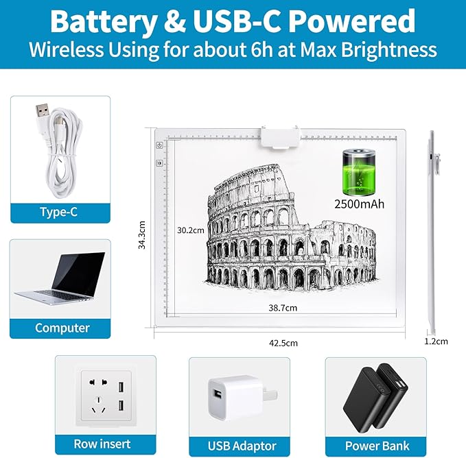 - 【 Built-in Battery and USB-C Powered 】 Our LED lightbox comes with a 2500mAh internal battery which allows you to use it any where without any power source, which makes your project more convenient as well as more enjoyable! Works for around 5-6 hours after charged 2 hours at a time. This A3 lightpad uses a USB-C interface to easily access any USB port, such as a USB wall charger, computer, laptop or mobile power bank. Also,the USB-C interface is more stable than the Micro interface.