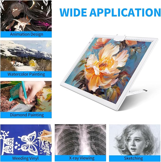 - 【 Wide Application 】 A3 tracing drawing board is large enough for diamond painting, weeding vinyl. It's also ideal for stenciling, 2D animation, calligraphy, embrossing, scrapbooking, tattoo transferring, sketching & drawing, streaming, sewing projects, stained glass, quilting etc. Best gifts for Christmas, Birthday or other holidays. If you are not satisfied with your purchase, please contact us, we will reply you within 24 hours.