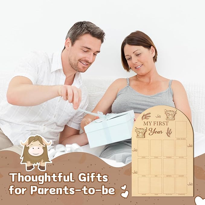 - Cute Highland Cow Design: Our baby picture frame come with hook and point stickers for you to hang and decoration. It is made of quality and thick wooden material for long-term use. The highland cow board with your baby's photo pasted on it will surely be the most beautiful sight at your baby's first year party.