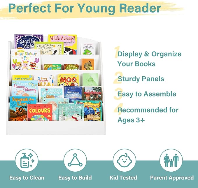- 【EASY TO ASSEMBLE & CLEAN】- This kids bookshelf and toy storage comes with complete accessories and a user manual for quick assembly. And all boards are labeled to save your time and effort. Moreover, the smooth surface of the kids book shelf is easy to maintain and can be wiped clean with a damp cloth.🧹🎉
