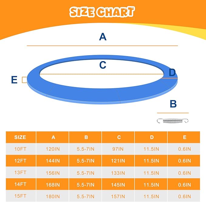 - 【Extra Wilder for More Specifications】This trampoline pad replacement is designed to fit 14 foot trampolines. With 11.5 inches / 29 cm width covering the area, this trampoline pad is suitable for spring lengths of 5.5", 6.5", up to 7", which means suitable for the majority of 14 foot trampolines in the market