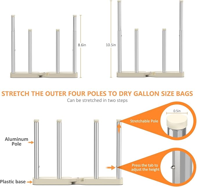 - 【Multi-Purpose Design】Aside from drying reusable food bags, you can also use it as a water bottle dryer rack, cup drying rack, and mason jars drying rack. just put them on the metal rod, drain the water as fast as possible.