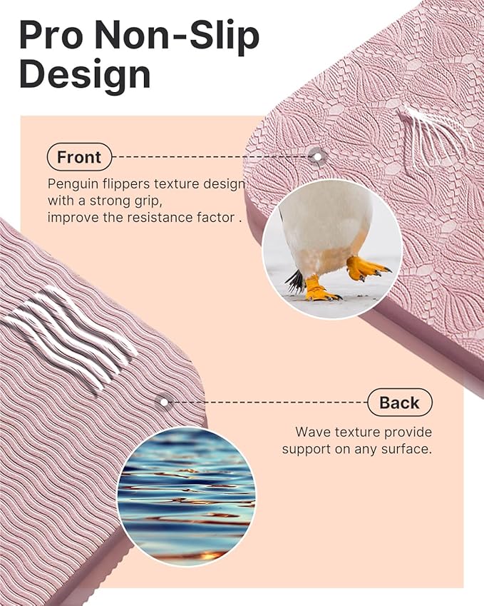 - Non-Slip Yoga Mats: Surface flippers webbing design, inspired by the penguin's flippers, improve the resistance factor, and sweat without slipping, strong and durable to prevent ripping suitable for yoga, pilates, weight training, and other floor exercises. Alignment Marks Yoga Mats are more helpful for beginners.